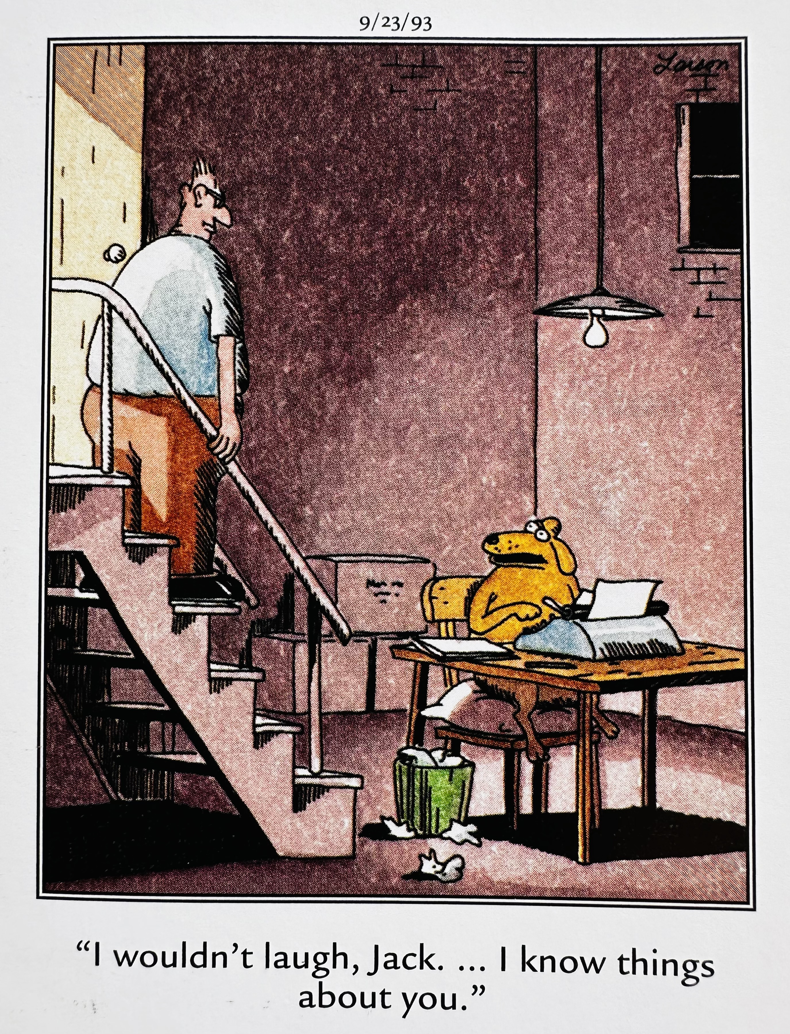 “Life is too short to wear tight shoes.” Not sure who said that, but right to the point. My advice; follow the Golden Rule, remember that life flies by in a heartbeat, get outside and sit by a tree, rescue a dog who will teach you more than you thought possible, laugh a little more, (especially at the one in the mirror) and start your own day with a Far Side.